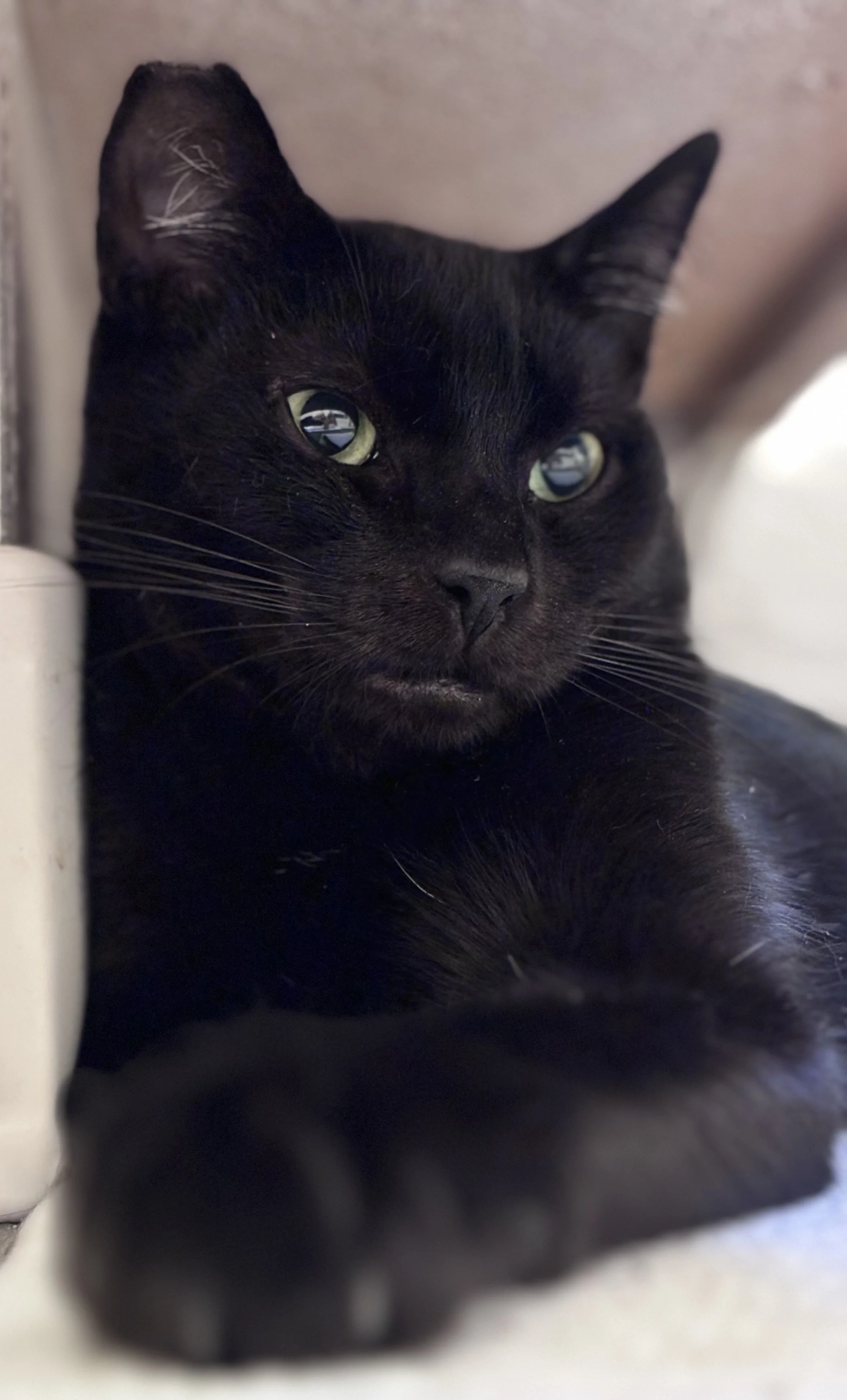 CinderFella has an amazing temperament. He loves other cats, gets along great with dogs, has excellent manners (no counter surfing here!), and has never had an accident. He’s easygoing with any type of litter and even enjoys using the automatic litter box—he thinks it’s fun when it spins after he leaves!